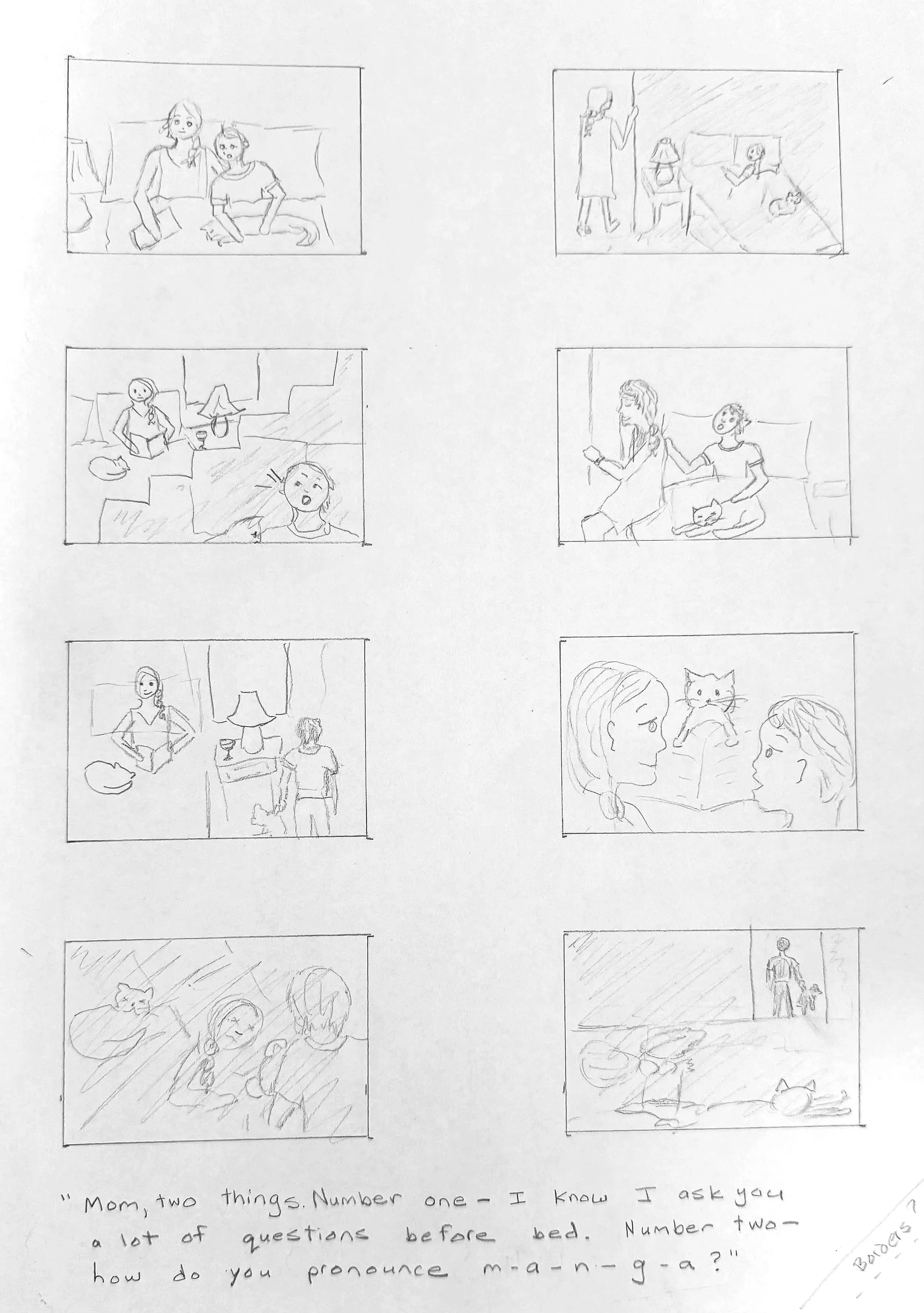 “Mom, two things. Number one- I know I ask you a lot of questions before bed. Number two - how do you pronounce m-a-n-g-a?”